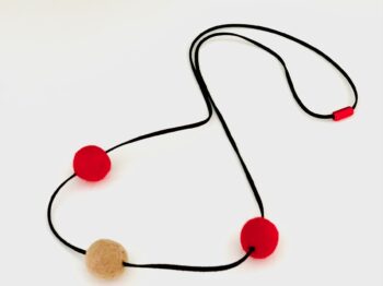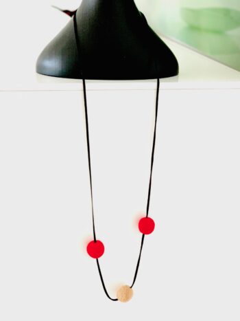 Moderner und nachhaltiger Halsschmuck aus Lederband und Wollkugeln.