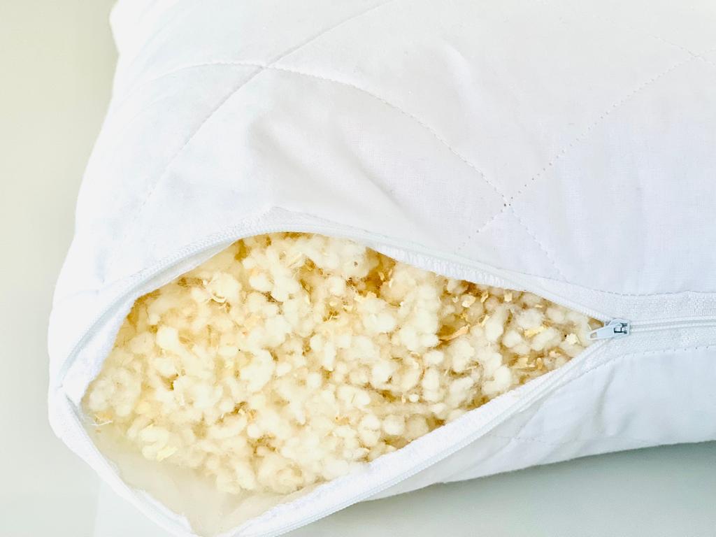 Die Schafschurwolle ist ein wärme-spendender naturbelassener Füllstoff. Die feinen Zirbenflocken sorgen für eine leichte Waldnote.